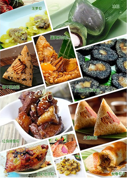 如今的粽子更是多種多樣,璀璨紛呈。現(xiàn)今各地的粽子,一般都用箬殼包糯米,但內(nèi)含的花色則根據(jù)各地特產(chǎn)和風(fēng)俗而定,著名的有桂圓粽、肉粽、水晶粽、蓮蓉粽、蜜餞粽、板栗粽、辣粽、酸菜粽、火腿粽、咸蛋粽等等。