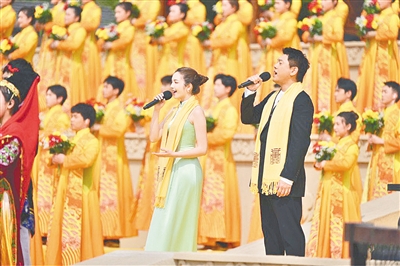 高唱頌歌。來自香港地區的鐘鎮濤、臺灣地區的朱孝天和澳門地區的麥嘉欣以及內地的曹芙嘉,與56個民族的少年兒童一起,同歌《黃帝頌》,共聚家國情。