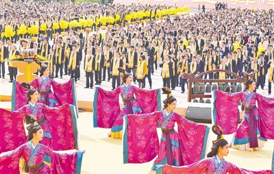 恭讀拜文。“粵稽遐古,天地洪荒,具茨綿綿,我祖是降……”王光謙登上拜祖臺,以全球華人之名,肅手恭頌。